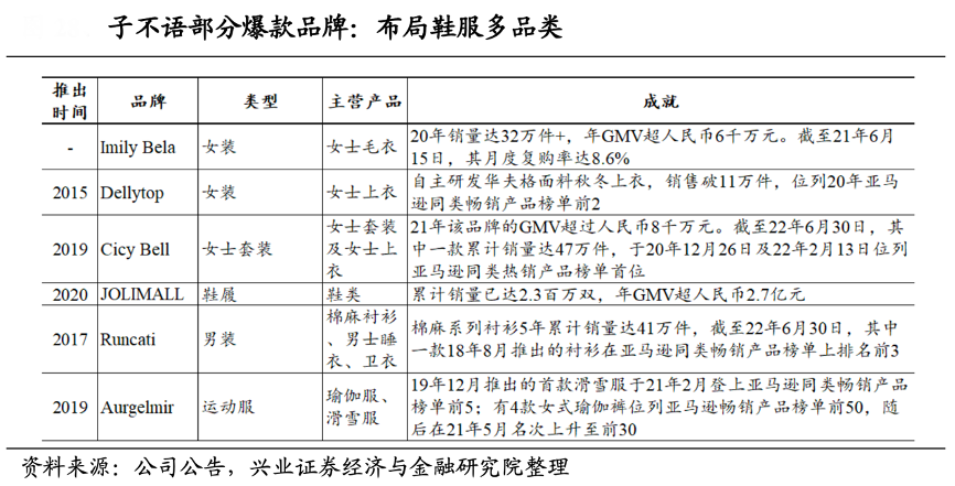 經(jīng)典案例:根據(jù)公司公告、興業(yè)證券經(jīng)濟與金融研究院等綜合資訊表明,子不語采取多品牌運營模式,重視爆品的打造,截至 2022 年 6 月 30 日,已經(jīng)孵化有超 300 個品牌,其中有 87 家年營收超過千萬元的爆款品牌,包括女裝、男裝、鞋履、運 動服等多種品類;。2022年上半年,子不語熱銷產(chǎn)品的營收貢獻達到 78.8%以上,為公司業(yè)績快速發(fā)展的主要驅(qū)動力。