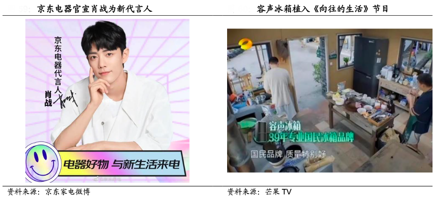 經(jīng)典案例:根據(jù)京東家電微博、芒果TV、國(guó)海證券研究部等綜合資訊表明,結(jié)合2022 年京東大數(shù)據(jù) 顯示,2021 年 1 月至 2022 年 1 月京東線上洗衣機(jī)營(yíng)銷(xiāo)方式中 IP 聯(lián)名、明星同 款分別占比 27%、16%,年輕流量帶動(dòng)消費(fèi)已有所成效。2022Q3 容聲贊助的綜 藝《向往的生活》熱播,容聲冰箱產(chǎn)品植入蘑菇屋,節(jié)目期間容聲冰箱與節(jié)目相關(guān)話題閱讀量超過(guò)1億、視頻播放量達(dá)到 2.7 億,超百萬(wàn)人參與互動(dòng),帶動(dòng)容聲冰箱 2022Q3 營(yíng)收增長(zhǎng)27%。
