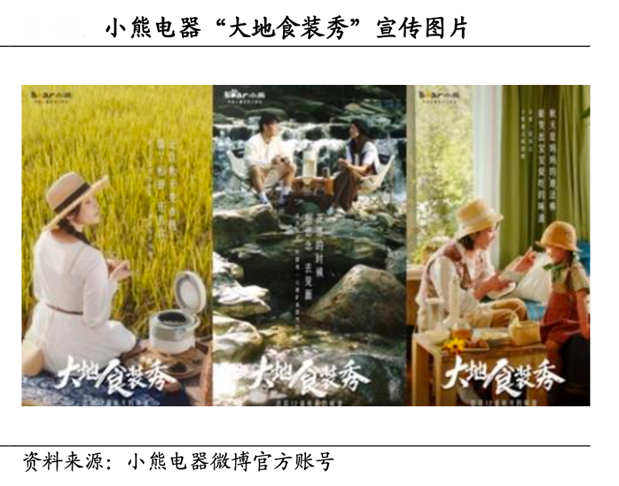 經(jīng)典案例:根據(jù)小熊電器微博官方帳號(hào)、國(guó)海證券研究部等綜合資訊表明,2022 年 5 月小熊電器將品牌戰(zhàn)略定位為“年輕人喜歡的小家電”,其 11 月發(fā)布的“大地食裝秀”系列視頻,構(gòu)建了戶(hù)外的沉浸式場(chǎng)景,在稻香中用電飯煲煮飯、在玫瑰園里用養(yǎng)生壺煮玫瑰花茶等畫(huà)面迎合了當(dāng)代年輕人對(duì)小家電的儀式感、促進(jìn)精致生活的要求,傳達(dá)了品牌“精致”的生活理念。