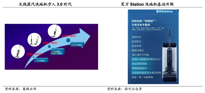 經(jīng)典案例:根據(jù)奧維云網(wǎng)、添可公眾號、國海證券研究所等綜合資訊表明,無線蒸汽洗地機開啟行業(yè) 3.0 時代,基站自動化升級解決清洗痛點。1)無線蒸汽洗地機:2022 年 8 月安克創(chuàng)新子品牌悠飛馬赫推出無線蒸汽洗地機 V1 Ultra, 隨后追覓推出 T12,添可推出芙萬 Steam2.0,實現(xiàn)高溫清潔除菌,針對性解決 養(yǎng)寵一族、重度清潔愛者、精致寶媽等核心用戶需求,有望進一步打開市場。2) 基站升級:人工排污換水始終是洗地機產(chǎn)品的痛點,無法真正解放雙手。2022年 9 月發(fā)布芙萬 Station 洗地機“空間站”,實現(xiàn)自動補水、排污、沖洗、自清潔等新功能。