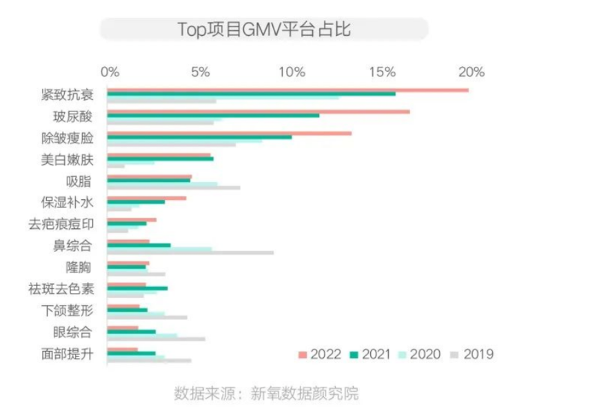 典型現(xiàn)象:根據(jù)新氧數(shù)據(jù)顏究院等綜合資訊表明,2022 年新氧 TOP10 項(xiàng)目 GMV 合計(jì)平臺(tái)占比高達(dá) 80%,說(shuō)明消費(fèi)者選擇醫(yī)美項(xiàng)目呈現(xiàn)顯著集中趨勢(shì),緊致抗衰、玻尿酸、除皺瘦臉進(jìn)入消費(fèi)者?選的醫(yī)美項(xiàng)目前 3 名。