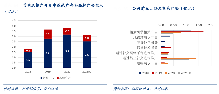 經典案例:根據招股說明書、華創證券等綜合資訊表明,雍禾銷售費用中營銷及推廣開支占近 7 成,其中線上渠道占比營銷推廣費用近 8 成,主要以 效果廣告為主,2020年公司投入效果廣告 3.2 億元,占總營銷費用約40.7%。根據公司披露的前五大供應商,公司主要投放搜索引擎類廣告和線上社交廣告,百度、微博、嗶哩嗶哩和抖音為公司主要的投放平臺,品 牌廣告占總營銷費用比重則從 2018 年的 5.0%提升至 21H1 的 11.0%。