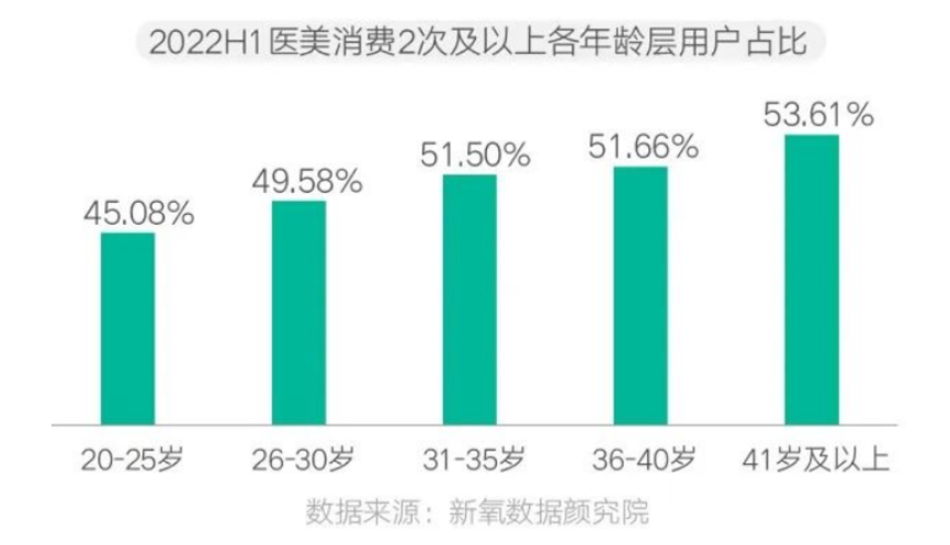 典型現(xiàn)象:根據(jù)新氧數(shù)據(jù)顏究院等綜合資訊表明,分年齡層來看,20-25 歲的用戶中,2022 年 H1 醫(yī)美消費 2 次及 2 次以上的用 戶占比達 46.08%,26-30 歲年齡區(qū)間的用戶占比 49.58%,相比之下,31-35 歲的醫(yī) 美用戶中,有51.5%的用戶消費 2 次及 2 次以上,41 歲及以上用戶的占比更是高 達 53.61%。