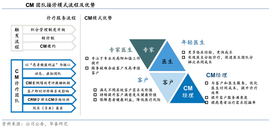 經(jīng)典案例:根據(jù)公司公告、華泰研究等綜合資訊表明,通策醫(yī)療公司以醫(yī)生為核心生產(chǎn)力進(jìn)行資源配置,積極推行以患者為中心的 CM(Case Manager)團(tuán)隊(duì)接診模式,通過分工將醫(yī)生時間更多分配至專業(yè)化程序,以實(shí)現(xiàn)分類管理、精準(zhǔn)服務(wù)的效果。