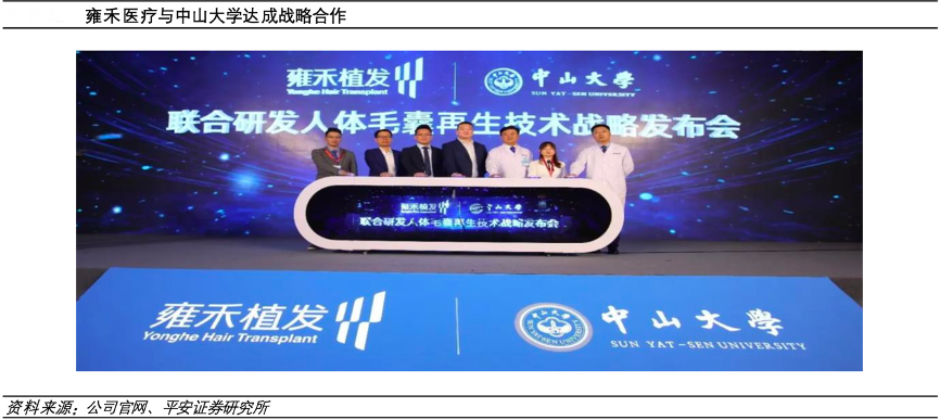 經典案例:根據公司官網、平安證券研究所等綜合資訊表明,雍禾醫療與中山大學達成戰略合作,研究異體毛囊移植免疫排斥解決方案、新型預防焦慮誘導脫髮的小分子藥物開發、多功能型植髮手術床、溫和型泡沫洗髮水等,并初步取得成果。2021年,公司與四川大學華西醫院合作雄脫治療新靶點項目,進一步在防脫植發領域深耕。