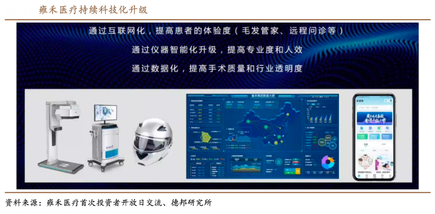 經(jīng)典案例:根據(jù)雍禾醫(yī)療首次投資者開(kāi)放日交流、德邦研究所等綜合資訊表明,雍禾醫(yī)療公司為線上咨詢(xún)服務(wù)推出一套智能咨詢(xún)服務(wù)軟件,該軟件有助于在線對(duì)患者進(jìn)行初步篩查及分診,提供便捷的在線咨詢(xún)與術(shù)后服務(wù)。此外公司的智能化設(shè)備如毛囊檢測(cè)儀等可減少勞動(dòng)成本。毛囊檢測(cè)儀體現(xiàn)了智能圖像識(shí)別、大數(shù)據(jù)算法等先進(jìn)技術(shù),可為患者提供精準(zhǔn)的醫(yī)學(xué)檢測(cè)報(bào)告進(jìn)行多維度分析,大幅提升患者就診體驗(yàn)感和服務(wù)的專(zhuān)業(yè)素質(zhì)。