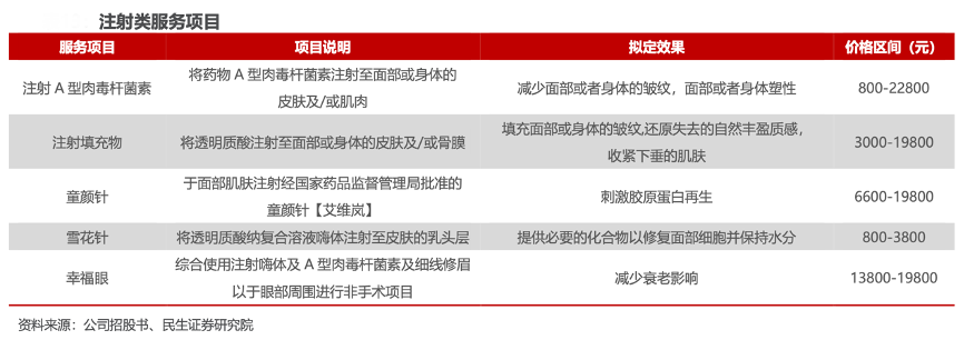 經典案例:根據公司招股書、民生證券研究院等綜合資訊表明,截至 2022H1,美麗田園公司共提供 10 類能量儀器與注射服務,涵蓋超過 300 個 SKU。 能量儀器類價格更高,價格范圍為 800 元到 66000 元,注射類服務對服務人員資質要求更高,價格范圍為 800 到 22800 元。