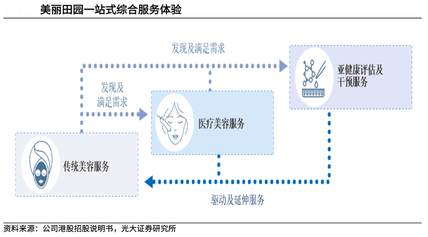 經典案例:根據公司港股招股說明書、光大證券研究所等綜合資訊表明,美麗田園2021-1H2022 期間,分別有21.7%及 21.2%的傳統美容服務會員購買了醫療美 容服務或亞健康評估及干預服務。除生活美容會員向醫美服務及亞健康評估及干預服務轉介,醫美及亞健康服務的術前術后均存在日常護理和修復維穩的需求,借此向生活美容業務導流,提高生活美容消費頻次。