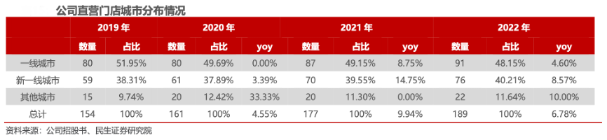 經(jīng)典案例:根據(jù)公司招股書、民生證券研究院等綜合資訊表明,截至 2022 年末,美麗田園公司擁有 189 家直營店及 189 家加盟店,門店覆蓋中國內地 25 個省、共 121 個城市。公司已于北京、上海及深圳這三個一線城市擁有 91 家直營門店,在新一線城市擁有額外 76 家門店,占直營門店總數(shù)的 88.4%。