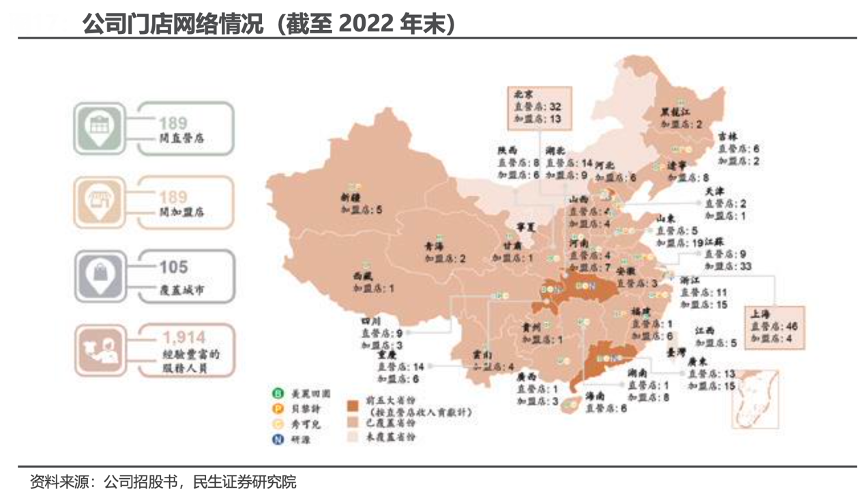 經(jīng)典案例:根據(jù)公司招股書、民生證券研究院等綜合資訊表明,美麗田園及貝黎詩門店均以直營店模式及加盟店模式經(jīng)營,秀可兒門店及研源醫(yī)療中心僅以直營店模式經(jīng)營。直營店在總收入中占比較大,2019-2022 年,其分別貢獻了 總收入的 91.8%/94.0%/94.1%/93.2%。