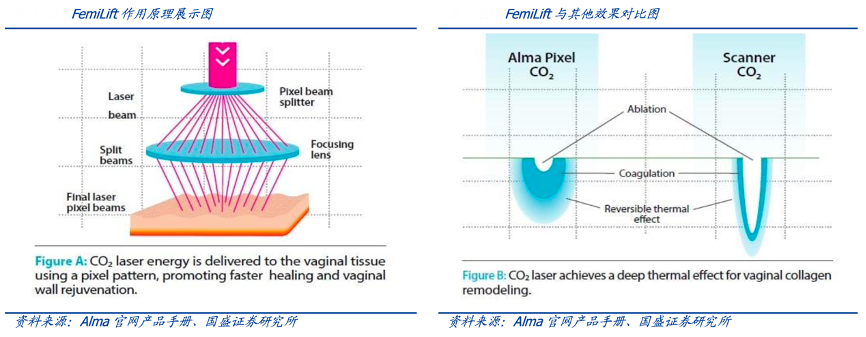 經(jīng)典案例:根據(jù)Alma官網(wǎng)產(chǎn)品手冊、國盛證券研究所等綜合資訊表明,F(xiàn)emiLift 聚焦女性私密美容,通過獨(dú)特的長波脈沖,并利用 CO2 點(diǎn)陣激光來實(shí)現(xiàn)傳遞更高的能量。與同類產(chǎn)品相比,F(xiàn)emilift 由于獨(dú)有的 VRT 技術(shù),具備治療效率高、舒適度高等優(yōu)點(diǎn),單次治療 時(shí)長通常僅需 15min,且由于療程采用一次性 DOE 保護(hù)罩,無交叉感染風(fēng)險(xiǎn)。