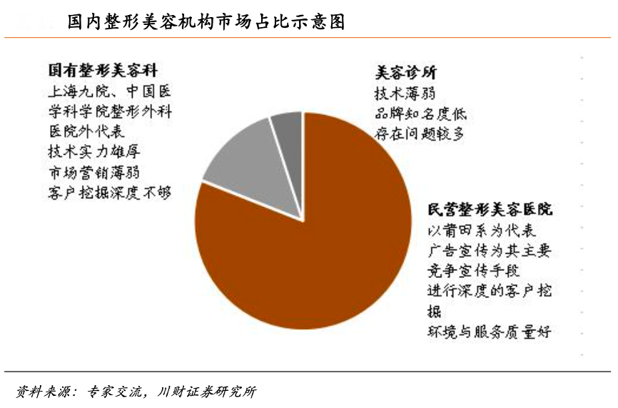 經典案例:根據專家交流、東莞證券研究所等綜合資訊表明,整形美容主要是 以民營整形美容醫院為主,其中以莆田系為代表,由于廣告宣傳推銷到位,目前民營業績占據80%以上的市場份額;國有整形美容科因為技術實力雄厚,但是因為服務質量差、市場營銷薄弱和客戶挖掘深度不夠導致市場占有率不足 15%。