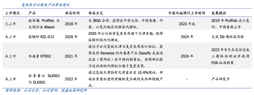 經典案例:根據公司公告、公司官網、國盛證券研究所等綜合資訊表明,復銳醫療科技公司在原有能量醫美產業的基礎上,2019 年把握市場風向積極開拓全新注射醫美市場。目前公司通過借助 Alma 和復星醫藥兩大平臺,合作 與國際先進企業的投資和合作布局了玻尿酸、溶脂針、肉毒素和絲素蛋白等重要領域,現玻尿酸產品 Profhilo 已上市。