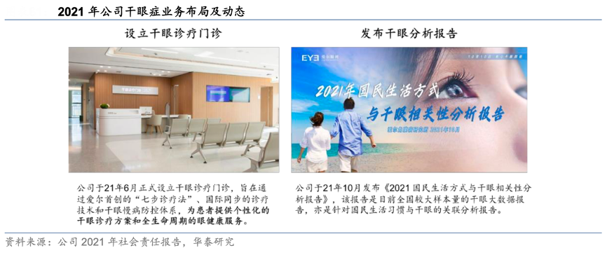 經典案例:根據(jù)公司2021年社會責任報告、華泰研究等綜合資訊表明,愛爾眼科公司不斷加大針對干眼的診療投入并于2021年設立干眼診療門診,通過愛爾首創(chuàng)的“七步診療法”、國際同步的診療技術和干眼慢病防控體系,為干眼患者提供個性化診療方案和全生命周期的眼健康服務。