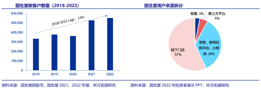 經典案例:根據固生堂招股書、固生堂2021、2022年報、固生堂2022年投資者演示PPT、申萬宏源研究等綜合資訊表明,新客戶數量方面,隨著線下和各類線上平臺(官微、官網、小程序)的發展,固生堂公司新客戶數量實現穩健增長,從 2018 年的 33 萬增長至 2022 年的 55 萬,2018-2022年的復合增速為 13%。其中57%的客戶來自線下門店,35%來自線上平臺,僅有5%來自第三方平臺。
