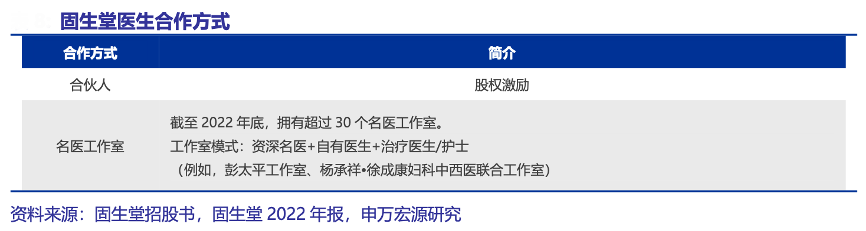 經典案例:根據固生堂招股書、固生堂2022年報、申萬宏源研究等綜合資訊表明,固生堂公司加強名醫工作室建設,截至2022年底,公司擁有超過 30 個名醫工作室,通過師帶徒模式,傳承名醫經驗,同時加強自有醫生的經驗培養。名醫工作室一般由資深名醫醫師、自有醫師、治療醫師或護士組成。通過資深醫師帶教年輕醫生,培養診療能力,并且可接收帶教醫師的復診患者。