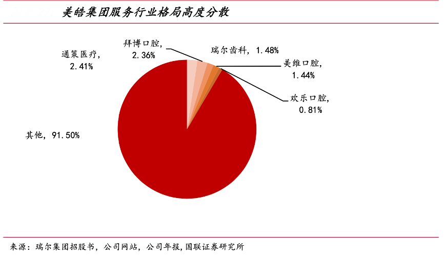經(jīng)典案例:根據(jù)瑞爾集團(tuán)招股書、公司網(wǎng)站、公司年報(bào)、國(guó)聯(lián)證券研究所等綜合資訊表明,由于我國(guó)民營(yíng)口腔業(yè)態(tài)以診所為主,且口腔診所投入資本、監(jiān)管、運(yùn)營(yíng)等要求較低,部分在行業(yè)內(nèi)稍有影響力的牙醫(yī)會(huì)選擇開辦個(gè)體診所,因?yàn)楦窬州^為分散,CR5 僅為 8.5%。其中瑞爾集團(tuán)排名第三,市占率為 1.48%。