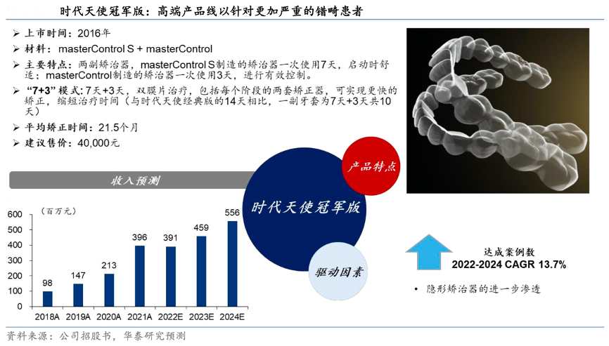 經(jīng)典案例:根據(jù)公司招股書、華泰研究等綜合資訊表明,時代天使冠軍版是公司的高端產(chǎn)品線,具有多膜設計,采用時代天使的領先材料(masterControl 和 masterControl S)。該產(chǎn)品具有特殊 的“7+3”矯治模式,能使矯治復雜病例患者牙齒的雙膜片診療過程更加舒適。