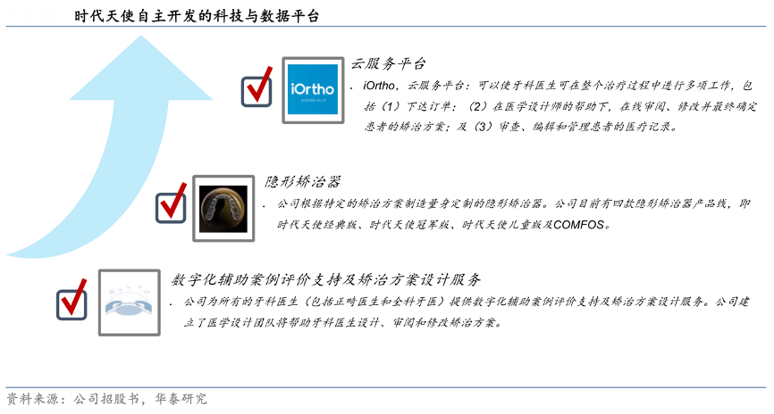 經(jīng)典案例:根據(jù)公司招股書、華泰研究等綜合資訊表明,時代天使兩大服務平臺:通過優(yōu)質服務全方位賦能牙科醫(yī)生。截至 2021 年底,時代天使已服務 25,000 名牙科醫(yī)生,且向更多牙醫(yī)進一步滲透的空間廣闊(根據(jù)其招股說明書,2020 年,中國有 6,100 名正畸醫(yī)生和 277,500 名全科牙醫(yī)),主要依靠兩大平臺推動:其中之一是A-treat,擁有亞洲最大的口腔科數(shù)據(jù)庫,可為全科牙醫(yī)設計成型方案,方便他們直接在線確認或調整方案。