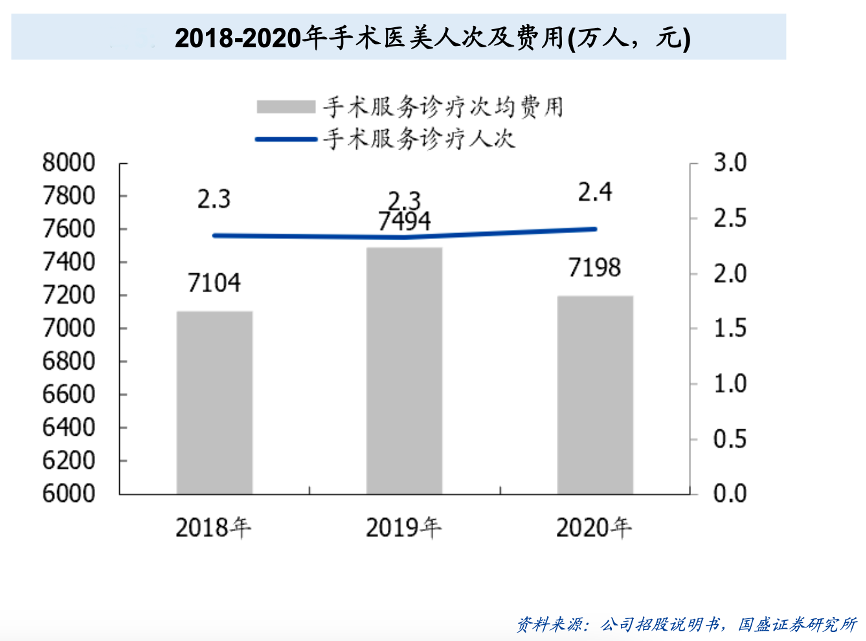 經(jīng)典案例:根據(jù)公司招股說明書、國盛證券研究所等綜合資訊表明,伊美爾手術(shù)業(yè)務(wù)主要包括眼部手術(shù)、鼻部手術(shù)、胸部整形手術(shù)、脂肪手術(shù)等美容整形手術(shù)。從診療人次來看,2018-2020年基本穩(wěn)定,分別為2.3/2.3/2.4萬人;從次均費(fèi)用來看,2018-2020年分別為7104/7494/7198元,但不同項(xiàng)目之間價(jià)格分化較大。