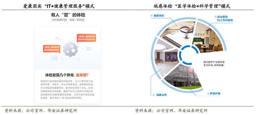 經典案例:根據公司官網、華安證券研究所等綜合資訊表明,截至 2022 年底,美年健康+慈銘體檢市場份額約26%;愛康國賓位居第二,份額約 15%;瑞慈體檢以 3.3%的市場份額排名第三。各大機構圍繞市場定位、資源整合、盈利模式、平臺戰略和價值創 造等領域加強商業模式創新。例如美年大健康通過參股收購模式整合資源、愛康國賓推出“IT+健康管理服務”模式、瑞慈提出“醫學體檢+科學管理”模式等。