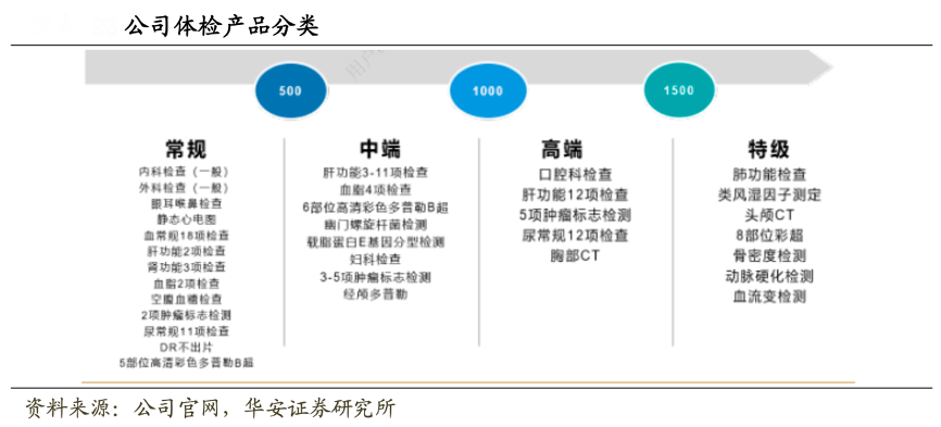 經典案例:根據公司官網、華安證券研究所等綜合資訊表明,區別于傳統體檢套餐,“美年好醫生”聚 焦單病種,依據疾病診斷“金標準”,針對心腦血管、糖尿病、腫瘤高發疾病和消費者的不同健康需求,定制個性化、多樣化的慢病及防癌體檢套餐,讓消費者體驗全流程的、個性化的、有保障的健康體檢和健康管理。體檢套餐種類豐富,價格定位分布從 300 元到 3000 元不等,實現中低端到高端體檢的全面覆蓋,從而滿足不同層次支付水平人群的消費需求。