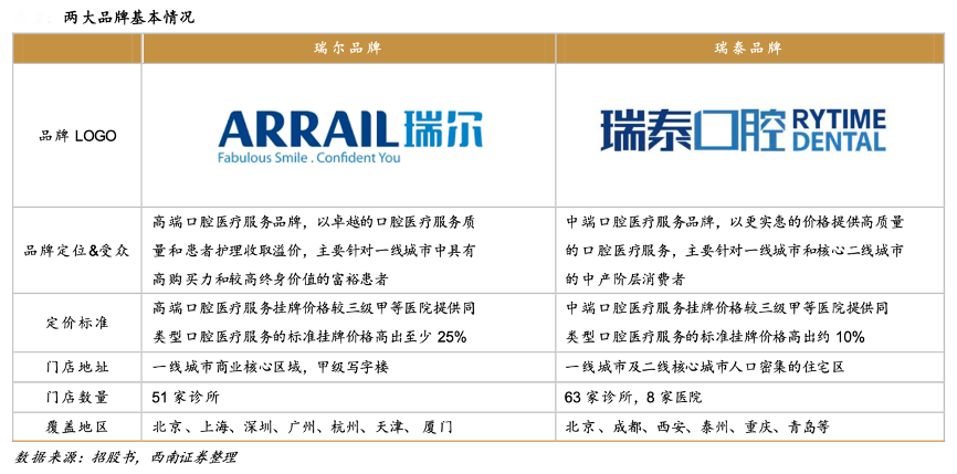 經典案例:根據招股書、西南證券等綜合資訊表明,針對不同消費群體需求,瑞爾集團將業務板塊拆分成針對一線及新一線富裕消費者的高端口腔醫療服 務——瑞爾牙科和為華北、華東、華南以及西區一線和核心二線城市中產階層服務的中端口腔服務瑞泰口腔。截至 2022 年 9 月 30 日,全國共有 51 家瑞爾診所,主要分布在北京、上海、深圳、廣州、杭州、天津和廈門七個城市。