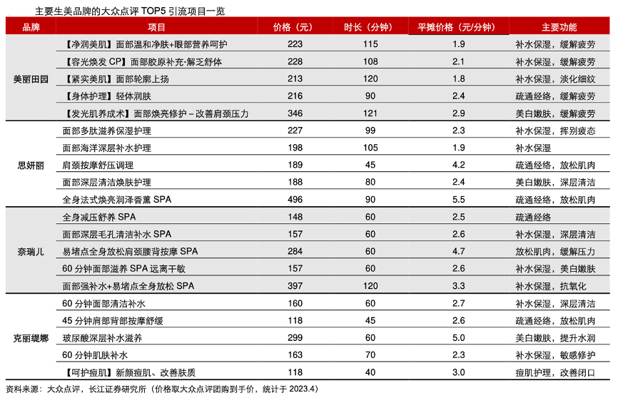 經(jīng)典案例:根據(jù)大眾點評、長江證券研究所等綜合資訊表明,美麗田園、思妍麗、奈瑞兒和克麗緹娜在大眾點評上主要陳列補水保濕、清潔、緩解疲勞類等基礎功效團購項目,到手價集中于 100-300 元之間,項目服務時間集中于 1-2h,從而減輕新客嘗鮮的資金成本和心理負擔,同時提供更充分的體驗時間,相對同質化的引流項目,使品牌方能夠更廣泛地覆蓋并觸達潛在客群。