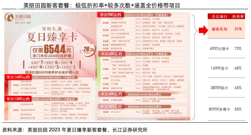 經(jīng)典案例:根據(jù)美麗田園2023年夏日臻享新客套餐、長江證券研究所等綜合資訊表明,以美麗田園新客禮包為例,其涵蓋多次數(shù)(26 次)+全 價格帶(單次 380-1680 元項目全覆蓋)項目的同時給予新客 31 折的極低折扣率,甚至 低于會員至尊卡的 55 折最低折扣,盡可能降低新客嘗鮮的資金成本,將消費者注意力牽引至服務質量和體驗感本身,以此區(qū)分出購買力、護膚需求與品牌相符的核心客群。