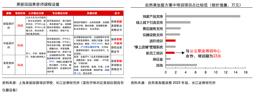 經(jīng)典案例:根據(jù)上海美麗田園培訓學校、自然美加盟政策2023年版、長江證券研究所等綜合資訊表明,美麗田園于 2005 年在上海市成立美麗田園培訓中心,2010 年進一步擴建為上海美麗田園培訓學校;克麗緹娜于 2002 年在上海設立培訓中心,2012年進一步擴建為哲美培訓學院。以美麗田園為例,其產(chǎn)品中約 90%來自進口,主要精力放在服務體系搭建上;對比來看,自然美加 盟方案中,品牌方的主要需求為加盟店帶動產(chǎn)品出貨,培訓相關項目價值量占比不到 10%,且采用委外模式,培訓期不到 1 個月(23 天),相比之下員工技能提升可能較慢。