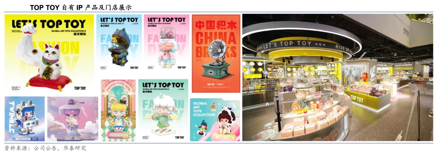 經典案例:根據公司公告、華泰研究等綜合資訊表明,TOP TOY 品牌門店銷售的潮玩產品涵蓋盲盒、積木、手辦、拼裝模型、玩偶、一番賞、雕塑和其他潮玩共 8 大品類。截至 2023 年 6 月 30 日,TOP TOY 提供約 7,000 個SKU。不 同于以玩具反斗城為代表的傳統玩具零售商(大多僅銷售第三方品牌),TOP TOY 還通過 IP 聯名、推出自有 IP 方式打造自有產品。