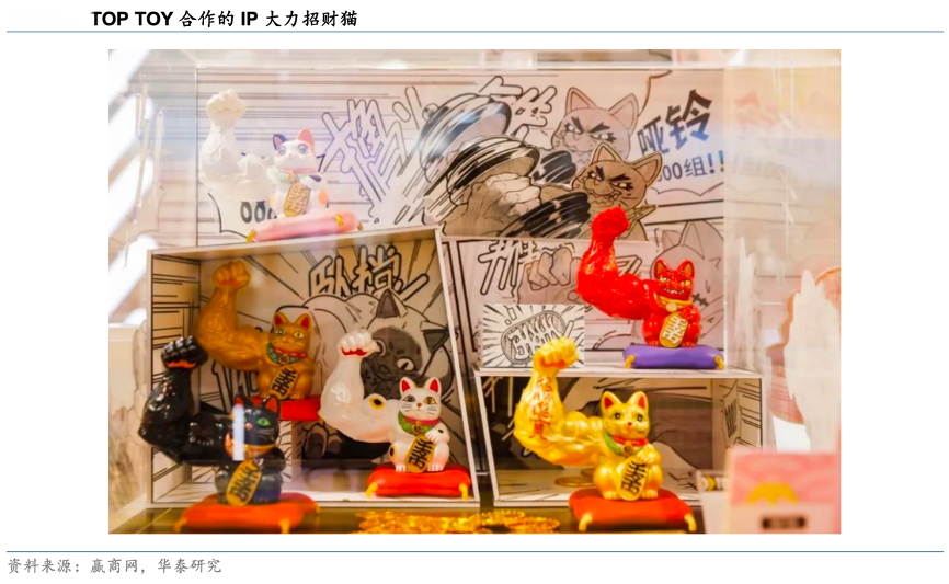 經典案例:根據贏商網、華泰研究等綜合資訊表明,TOP TOY 依托公司 IP 資源不斷豐富 IP 矩陣,截至 2022 年12 月 31 日,TOP TOY 已與 20 位 IP 許可方聯名開發出 300 逾款 TOP TOY 品牌下的 IP 產品。 以暢銷款 IP 大力招財 貓為例,TOP TOY 便是直接與藝術家徐振邦進行合作,通過供應鏈與營銷的賦能,將 IP 與產品結合推向消費者。