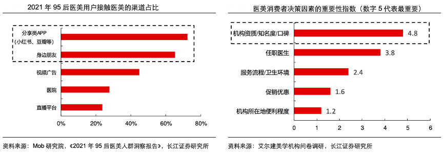 經典案例:根據Mob研究院、《2021年95年醫美人群洞察報告》、艾爾建美學機構問卷調研、長江證券研究所等綜合資訊表明,2021年 11 月市場監管總局頒布的《醫療美容廣告 執法指南》旨在重點打擊“醫美形象代言人”、制造“容貌焦慮”以及變相宣傳,嚴格規范了醫美宣傳渠道,消費者獲知醫美的信息渠道逐步從夸大失實的廣告轉向小紅書等相對客觀的分享類 APP 和親友間交流,此外醫美項目的高試錯成本進一步加大了新客對其他求美者經驗的關注,因而更加傾向于根據機構口碑來做出謹慎、理性的消費決策。