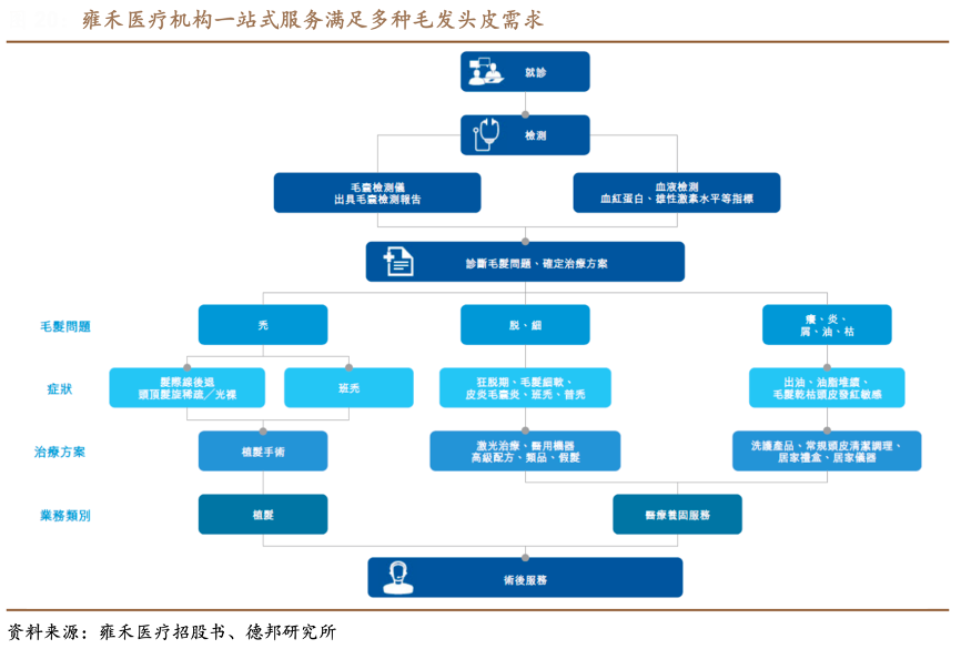 經典案例:根據雍禾醫(yī)療招股書、德邦研究所等綜合資訊表明,毛發(fā)醫(yī)療服務市場 分為植發(fā)醫(yī)療服務市場和醫(yī)療養(yǎng)固服務市場,雍禾醫(yī)療公司于 2017 年收購史云遜健發(fā)中心,開始布局醫(yī)療養(yǎng)固服務市場,2018 年開始在植發(fā)機構中建立“館中館”史云遜建發(fā)中心,提供醫(yī)療養(yǎng)固服務。雍禾主營業(yè)務仍舊是植發(fā)醫(yī)療服務,但醫(yī)療養(yǎng)固 服務營業(yè)收入占比呈現上升趨勢,2019 年雍禾醫(yī)療的植發(fā)醫(yī)療服務和醫(yī)療養(yǎng)固服務營業(yè)收入分別為 11.98 億元和1,500 萬元人民幣。