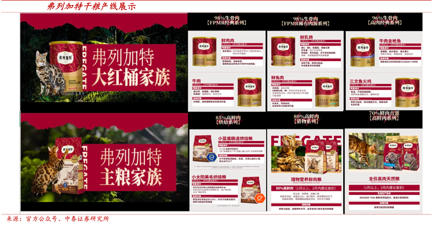 經(jīng)典案例:根據(jù)官方公眾號、中泰證券研究所等綜合資訊表明,弗列加特秉承開發(fā)少量、創(chuàng)新、精致、差異化的產(chǎn)品模式塑造品牌的高端形象。弗列加特每次推出的新產(chǎn)品、新口味都具有創(chuàng)新性和針對性。如近期新推出的小藍(lán)盾系列旨在改善貓咪腸道健康,緩解軟便和口臭的問題。