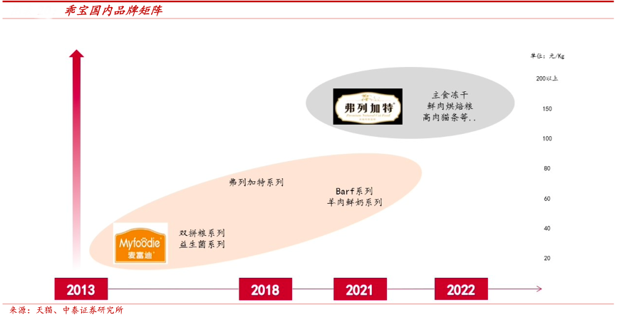 經(jīng)典案例:根據(jù)天貓、中泰證券研究所等綜合資訊表明,乖寶寵物公司2021年進(jìn)階高端市場(chǎng),完善品牌矩陣,提升品牌調(diào)性。2021年公司推出子品牌弗列加特(高端貓糧),收購(gòu)雀巢普瑞納旗下美國(guó)品牌 Waggin’Train(高端犬糧),代理 K9 進(jìn)軍高端寵食市場(chǎng)。
