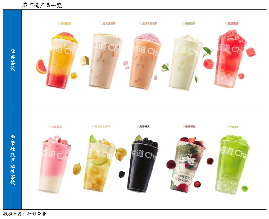 經(jīng)典案例:根據(jù)公司公告、國泰君安證券研究等綜合資訊表明,茶百道產(chǎn)品矩陣包括經(jīng)典茶飲和季節(jié)性、區(qū)域性茶飲。2023年,每家茶百道門店的月均SKU為 68款飲品,其中經(jīng)典產(chǎn)品SKU占比將近40%。經(jīng)典茶飲暢銷款包括楊枝甘露、豆乳玉麒麟、招牌芋圓奶茶、茉莉奶綠 和西瓜啵啵等,2023年前五大暢銷款零售額占比 32%。