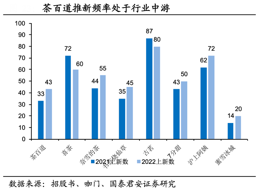 經(jīng)典案例:根據(jù)招股書、咖門、國泰君安證券研究等綜合資訊表明,茶百道公司持續(xù) 對消費者口味喜好的變化趨勢進(jìn)行調(diào)研與預(yù)判,通常每隔幾個月即上新季節(jié)限定款或區(qū)域限定款產(chǎn)品的方式持續(xù)為消費者帶來新穎、驚喜的茶飲體驗。2023 年,茶百道開發(fā)出約 250 多款產(chǎn)品,并推出了 48 款新品,升級了 13 款產(chǎn)品,飽受消費者好評。