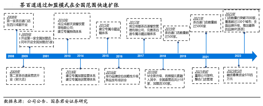 經典案例:根據公司公告、國泰君安證券研究等綜合資訊表明,茶百道 2008 年誕生于成都,通過加盟模式在全國范圍快速擴張。2019 年至 2021 年,在茶飲連鎖加盟浪潮下,茶百 道門店數量從 500 多家快速增長至超過 5000 家。2023 年 6 月,茶百道 完成新一輪融資,募資約 10 億元資金,領投方為蘭馨亞洲,跟投方包括 正心谷、草根知本、中金、番茄資本,投后估值接近 180 億元。