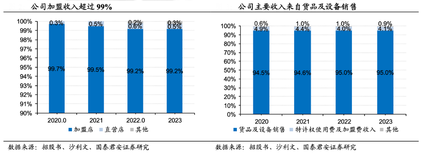 經典案例:根據招股書、沙利文、國泰君安證券研究等綜合資訊表明,茶百道公司主要收入來源為向加盟店銷售貨品及設備,加盟收入占比超99%。茶百道的收入主要是銷售貨品及設備,即向加盟店銷售乳制品、茶葉及水果等制作茶飲的材料及配料、以及包材及門店設備,2023年占比 95.0%。