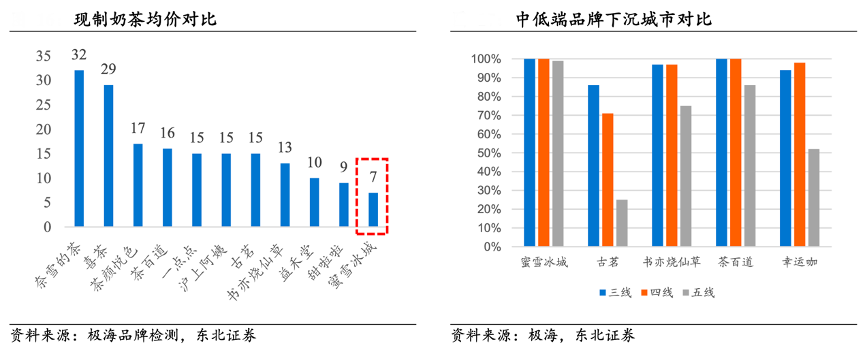 經典案例:根據極海品牌檢測、東北證券等綜合資訊表明,對比其他連鎖現制茶飲品牌,蜜雪冰城主打極致性價比,幾乎沒有競品客單價低于蜜雪冰城。公司以優質平價策略不僅收割了同類型競品的份額,同時承接了包裝茶飲市場中消費升級的需求,因此,公司定位的目標客群廣袤,受眾市場優于高端茶飲玩家,且在品牌定位上較其他中端競品更清晰。