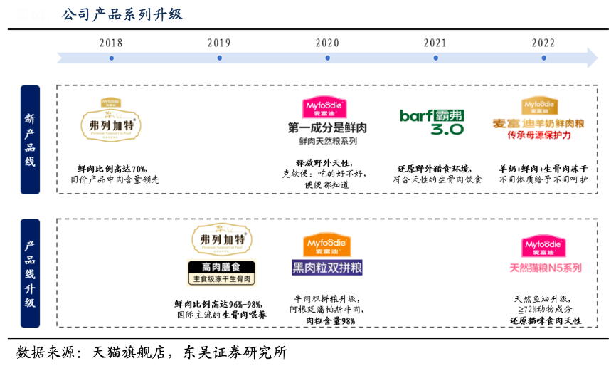 經(jīng)典案例:根據(jù)天貓旗艦店、東吳證券研究所等綜合資訊表明,乖寶寵物公司在 2015 年推出的牛肉雙拼糧市場反饋良好,因此公司不斷升級配方,推出鹿肉雙拼糧、黑肉粒雙拼糧等。雙管齊下的配方優(yōu)化可提升公司整體產(chǎn)品品質(zhì),實現(xiàn)品牌調(diào)性升級。