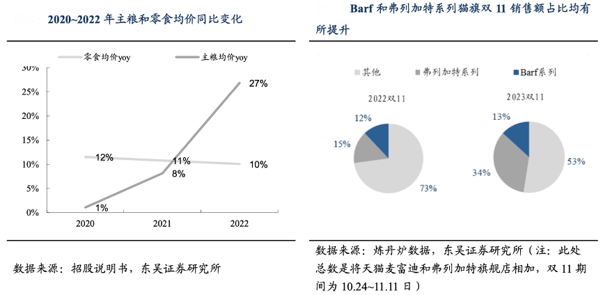 經(jīng)典案例:根據(jù)招股說明書、煉丹爐數(shù)據(jù)、、東吳證券研究所等綜合資訊表明,乖寶寵物隨著成分配方優(yōu)化和新產(chǎn)品線的推出均價趨于提升,產(chǎn)品均價趨于提升,2020-2022 年,公司主糧/零食/保健品及其他的 均價分別提升了 37%/22%/52%。其中,麥富迪的高端系列“Barf 系列”和高端貓糧“弗 列加特系列”均表現(xiàn)突出。