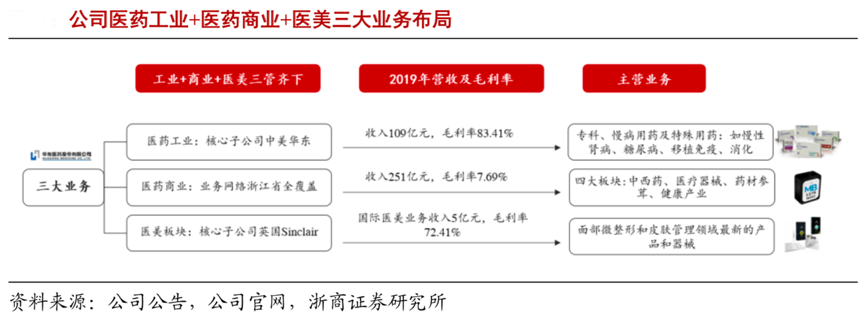 經典案例:根據公司公告、公司官網、浙商證券研究所等綜合資訊表明,華東公司業務覆蓋醫藥全產業鏈,以醫藥工業為主導,積極拓展醫藥商業和醫美產業,已發展成為集醫藥研發、生產、經銷為一體的大型綜合性醫藥公司。藥商業:收入占比 69%,毛利率 7.7%,公司收入主要來源,2019年其醫藥商業板塊營收達到 251 億元,繼續保持浙江省龍頭地位。