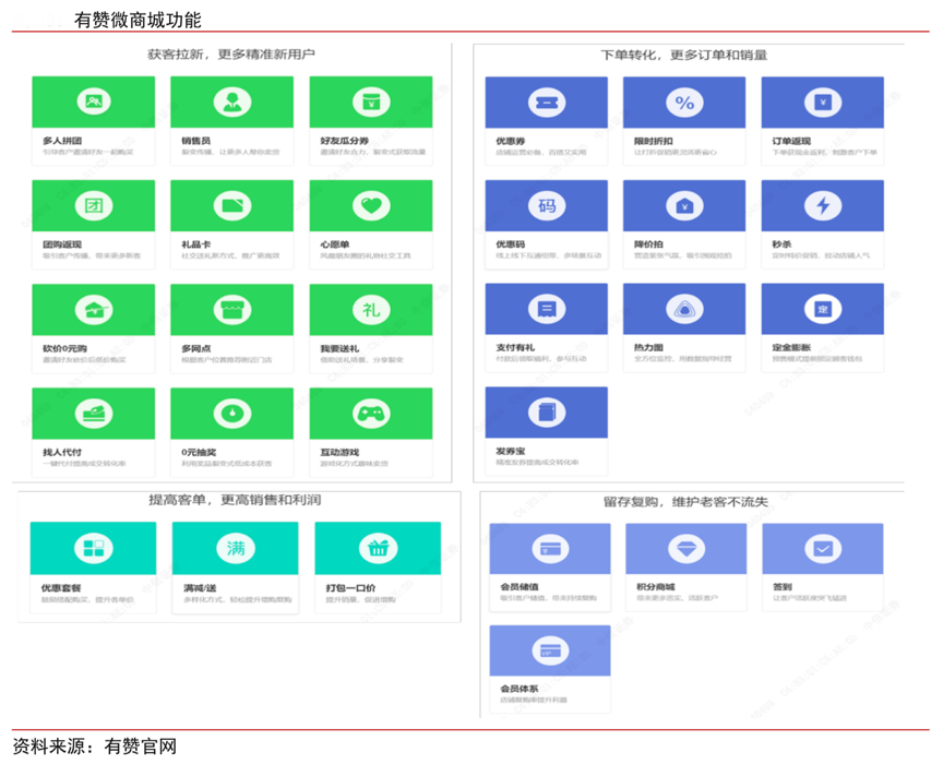 經典案例:根據有贊官網、中信證券研究部等綜合資訊表明,有贊微商城可幫助商家實現在微信、QQ、微博、小程序、支付寶生活號等十余個平臺的建站,實現線上全渠道開店。與此同時,面向商家的流量運營提供了近百種營銷玩法,如獲客拉新(多人拼團、銷售員、好友瓜分券、團購返券等)、下單轉化(優惠券、限時折扣、訂單返現等)、提高客單(優惠套餐、滿減 送、打包一口價)、留存復購(會員儲值、積分商城、簽到),通過多樣的功能促進商家經營。