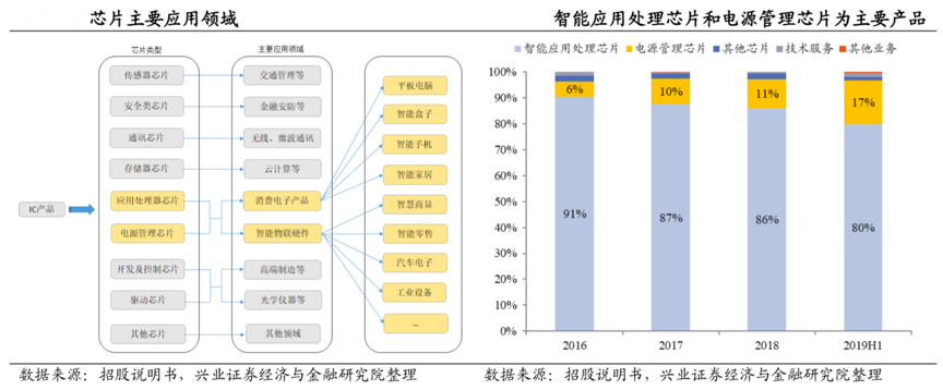 經典案例:根據招股說明書、興業證券經濟與金融研究院等綜合資訊表明,瑞芯微公司主要產品包括智能應用處理芯片和電源管理芯片,其應用處理器芯片主要應用于消費電子和智能物聯兩大領域,應用場景覆蓋平板電腦、智能機頂盒、智能手機、智能家居、汽車電子、智能安防等眾多領域;電源管理芯片則主要為與應用處理器SOC 芯片相配套的電源管理芯片和手機快充芯片。