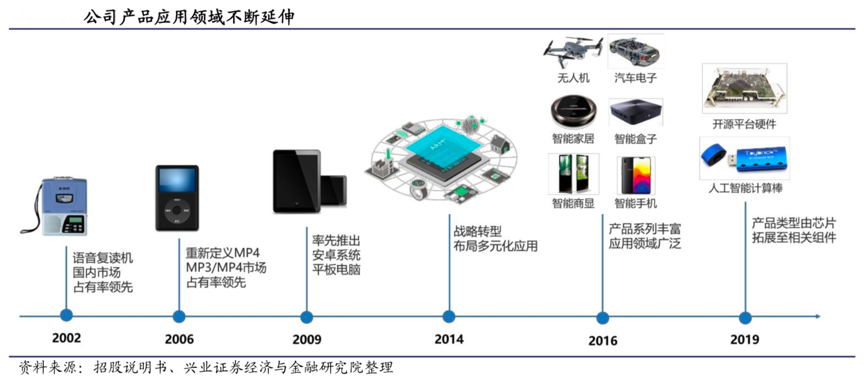 結合招股說明書、興業證券經濟與金融研究院等綜合資訊表明,瑞芯微公司2014 年起向消費電子和智能物聯應用領域延伸,并在 2016 年基本完成戰略轉型目標,產品系列不斷豐富,應用領域從單一的平板電腦應用市場擴展至智能盒子、商顯、車載等領域,并不斷向國際高端消費電子市場邁進。