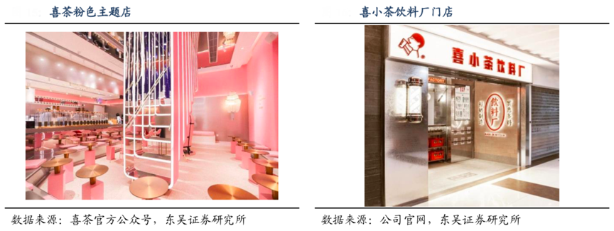 經典案例:根據喜茶官方公眾號、公司官網、東吳證券研究所等綜合資訊表明,為了針對不同消費場景的廣大消費者,新茶飲頭部品牌紛紛開設多種類型的茶飲店,包括主題店、快閃店、特色店等,這些門店具有現代風格的室內裝飾和時尚空間。如喜茶在2017 年推出了黑金店、粉色主題店等;2020 年 4 月喜茶還推出了定位大眾市場的“喜小茶”飲料廠等.