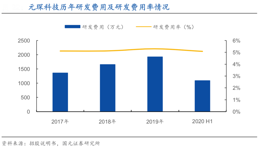 經(jīng)典案例:根據(jù)招股說明書、國元證券研究所等綜合資訊表明,元琛科技截止 2020年6月30日,其擁有授權(quán)專利77 項,其 中發(fā)明專利 24 項,實用新型 53 項,專注于過濾材料、脫硝領(lǐng)域的技術(shù)研發(fā),承擔(dān) 4 項國家項目,2017 年度、2018 年度、2019 年度、2020 年 1-6 月,公司研發(fā)費用分別為 1,348.14 萬元、1,697.22 萬元、1,815.14 萬元、 1,029.69 萬元,呈上升趨勢,占同期營業(yè)收入的比例為 5.06%、5.23%、5.00%、 5.74%。