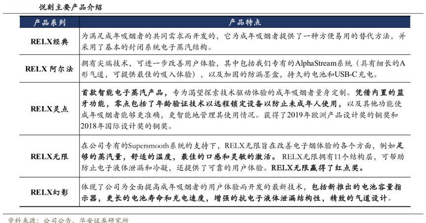 經典案例:根據公司公告、華安證券研究所等綜合資訊表明,霧芯科技公司在2018年 3 月發布第一代電子煙產品并迅速打開市場。2019 年,公司成立了國內首個獨立電子煙品牌實驗室 RELX Lab。2019 年 3 月,公司推出全新系列產品阿爾法。2019 年 9 月,悅刻靈點智能霧化煙發布。2019年其發布向陽花系統,打造全球嚴密未成年人保護網。